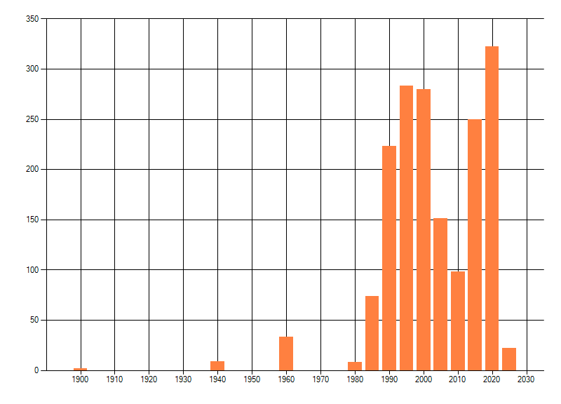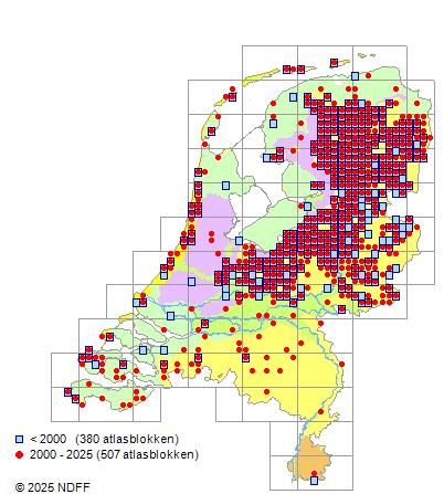 Het aantal atlasblokken (5x5 km) waarin de soort is gemeld binnen een periode van vijf jaar (vanaf 1980) of twintig jaar. Niet gecorrigeerd voor waarnemersinspanning en het aantal doorgegeven waarnemingen kan sterk variëren per periode, dus een trend in verspreiding kan hier niet direct uit worden afgelezen. Het opgegeven jaartal is het eerste jaar van de periode. Bron: gevalideerde waarnemingen uit de NDFF.