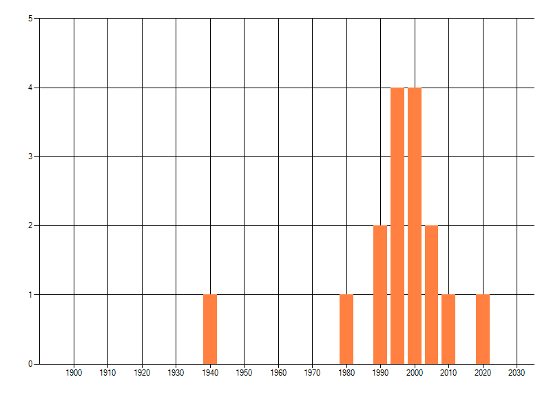 Het aantal atlasblokken (5x5 km) waarin de soort is gemeld binnen een periode van vijf jaar (vanaf 1980) of twintig jaar. Niet gecorrigeerd voor waarnemersinspanning en het aantal doorgegeven waarnemingen kan sterk variëren per periode, dus een trend in verspreiding kan hier niet direct uit worden afgelezen. Het opgegeven jaartal is het eerste jaar van de periode. Bron: gevalideerde waarnemingen uit de NDFF.