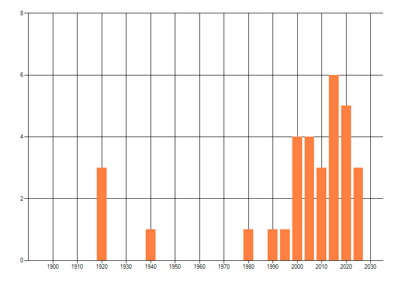 Het aantal atlasblokken (5x5 km) waarin de soort is gemeld binnen een periode van vijf jaar (vanaf 1980) of twintig jaar. Niet gecorrigeerd voor waarnemersinspanning en het aantal doorgegeven waarnemingen kan sterk variëren per periode, dus een trend in verspreiding kan hier niet direct uit worden afgelezen. Het opgegeven jaartal is het eerste jaar van de periode. Bron: gevalideerde waarnemingen uit de NDFF.