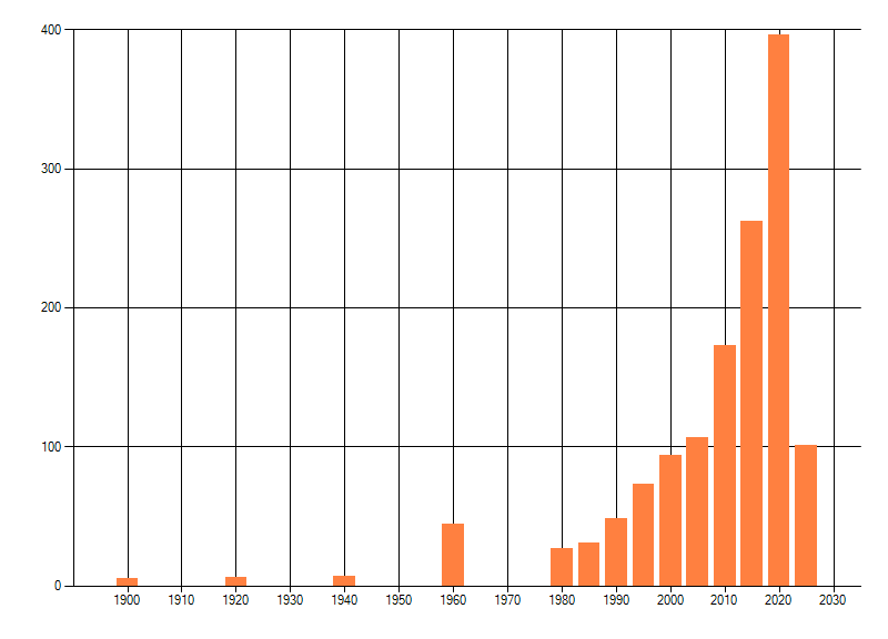 Het aantal atlasblokken (5x5 km) waarin de soort is gemeld binnen een periode van vijf jaar (vanaf 1980) of twintig jaar. Niet gecorrigeerd voor waarnemersinspanning en het aantal doorgegeven waarnemingen kan sterk variëren per periode, dus een trend in verspreiding kan hier niet direct uit worden afgelezen. Het opgegeven jaartal is het eerste jaar van de periode. Bron: gevalideerde waarnemingen uit de NDFF.