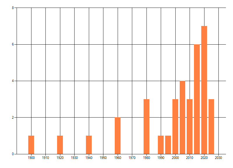 Het aantal atlasblokken (5x5 km) waarin de soort is gemeld binnen een periode van vijf jaar (vanaf 1980) of twintig jaar. Niet gecorrigeerd voor waarnemersinspanning en het aantal doorgegeven waarnemingen kan sterk variëren per periode, dus een trend in verspreiding kan hier niet direct uit worden afgelezen. Het opgegeven jaartal is het eerste jaar van de periode. Bron: gevalideerde waarnemingen uit de NDFF.
