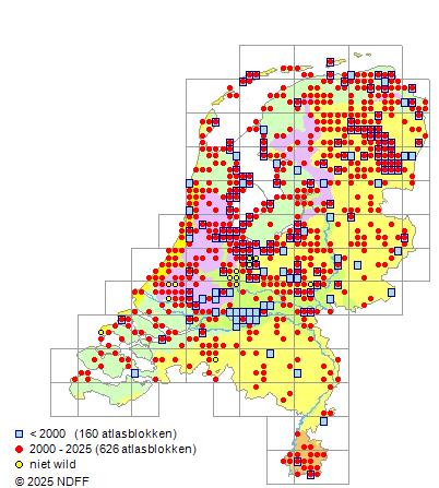 Het aantal atlasblokken (5x5 km) waarin de soort is gemeld binnen een periode van vijf jaar (vanaf 1980) of twintig jaar. Niet gecorrigeerd voor waarnemersinspanning en het aantal doorgegeven waarnemingen kan sterk variëren per periode, dus een trend in verspreiding kan hier niet direct uit worden afgelezen. Het opgegeven jaartal is het eerste jaar van de periode. Bron: gevalideerde waarnemingen uit de NDFF.