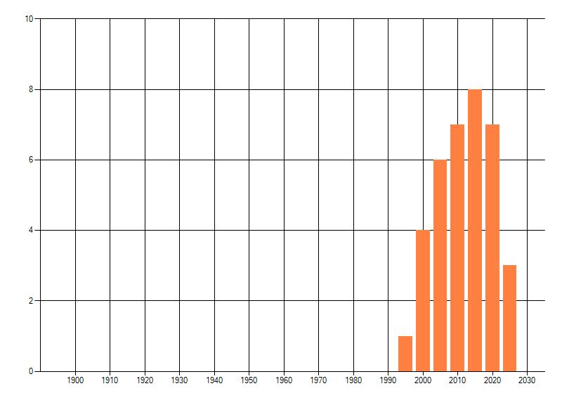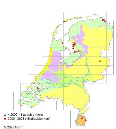 Het aantal atlasblokken (5x5 km) waarin de soort is gemeld binnen een periode van vijf jaar (vanaf 1980) of twintig jaar. Niet gecorrigeerd voor waarnemersinspanning en het aantal doorgegeven waarnemingen kan sterk variëren per periode, dus een trend in verspreiding kan hier niet direct uit worden afgelezen. Het opgegeven jaartal is het eerste jaar van de periode. Bron: gevalideerde waarnemingen uit de NDFF.