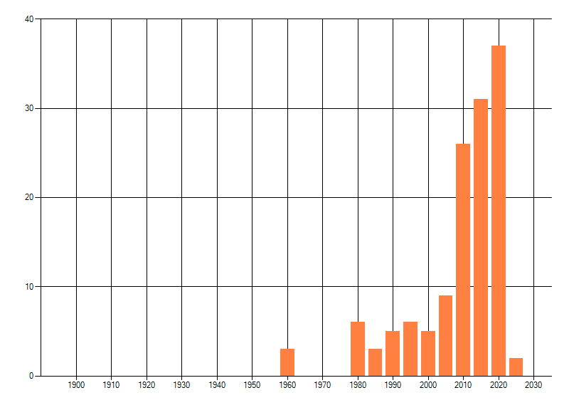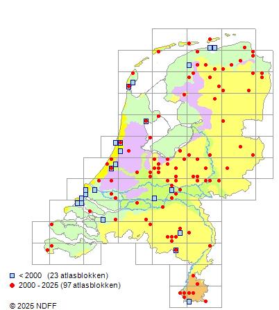 Het aantal atlasblokken (5x5 km) waarin de soort is gemeld binnen een periode van vijf jaar (vanaf 1980) of twintig jaar. Niet gecorrigeerd voor waarnemersinspanning en het aantal doorgegeven waarnemingen kan sterk variëren per periode, dus een trend in verspreiding kan hier niet direct uit worden afgelezen. Het opgegeven jaartal is het eerste jaar van de periode. Bron: gevalideerde waarnemingen uit de NDFF.