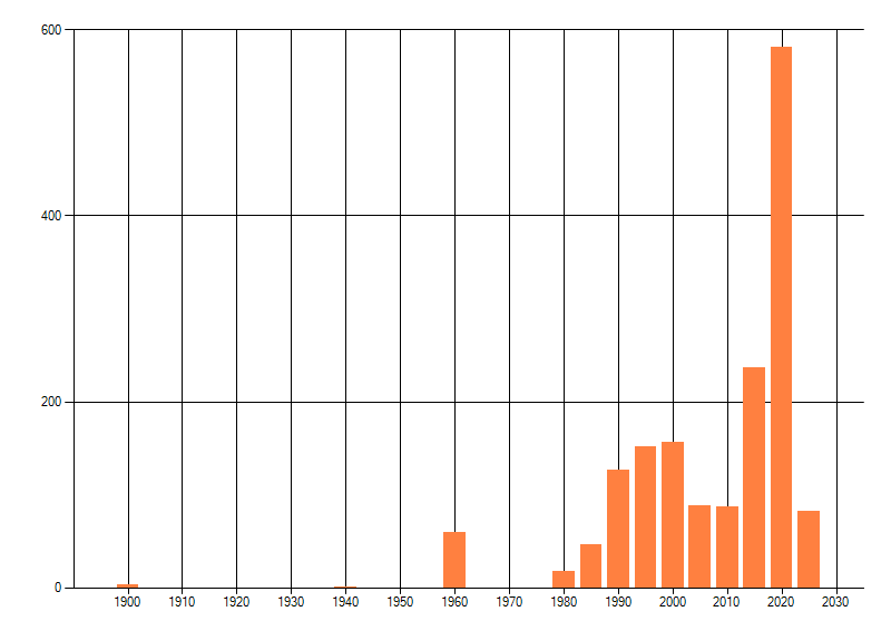 Het aantal atlasblokken (5x5 km) waarin de soort is gemeld binnen een periode van vijf jaar (vanaf 1980) of twintig jaar. Niet gecorrigeerd voor waarnemersinspanning en het aantal doorgegeven waarnemingen kan sterk variëren per periode, dus een trend in verspreiding kan hier niet direct uit worden afgelezen. Het opgegeven jaartal is het eerste jaar van de periode. Bron: gevalideerde waarnemingen uit de NDFF.