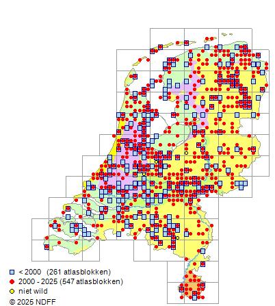 Het geschatte aantal atlasblokken (5x5 km) waarin de soort voorkomt per periode van vijf jaar. Bron: A. Aptroot et al. Basisrapport Rode Lijst Korstmossen 2011 © BLWG 2012.