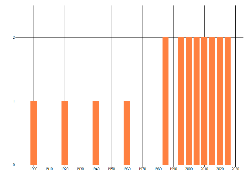 Het aantal atlasblokken (5x5 km) waarin de soort is gemeld binnen een periode van vijf jaar (vanaf 1980) of twintig jaar. Niet gecorrigeerd voor waarnemersinspanning en het aantal doorgegeven waarnemingen kan sterk variëren per periode, dus een trend in verspreiding kan hier niet direct uit worden afgelezen. Het opgegeven jaartal is het eerste jaar van de periode. Bron: gevalideerde waarnemingen uit de NDFF.