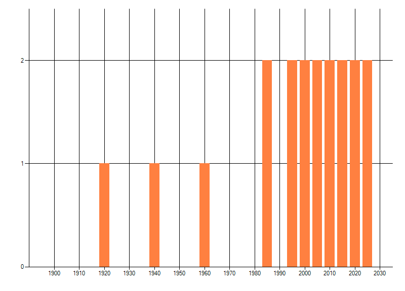 Het aantal atlasblokken (5x5 km) waarin de soort is gemeld binnen een periode van vijf jaar (vanaf 1980) of twintig jaar. Niet gecorrigeerd voor waarnemersinspanning en het aantal doorgegeven waarnemingen kan sterk variëren per periode, dus een trend in verspreiding kan hier niet direct uit worden afgelezen. Het opgegeven jaartal is het eerste jaar van de periode. Bron: gevalideerde waarnemingen uit de NDFF.