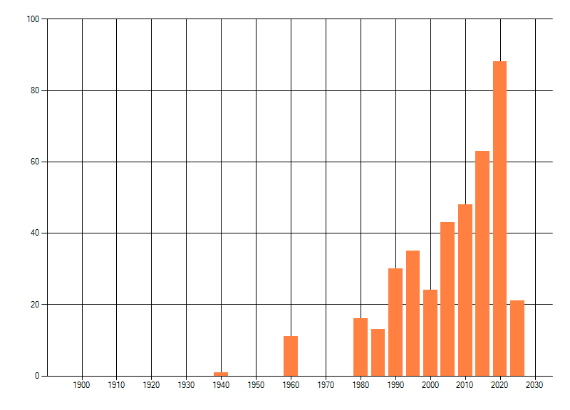 Het aantal atlasblokken (5x5 km) waarin de soort is gemeld binnen een periode van vijf jaar (vanaf 1980) of twintig jaar. Niet gecorrigeerd voor waarnemersinspanning en het aantal doorgegeven waarnemingen kan sterk variëren per periode, dus een trend in verspreiding kan hier niet direct uit worden afgelezen. Het opgegeven jaartal is het eerste jaar van de periode. Bron: gevalideerde waarnemingen uit de NDFF.