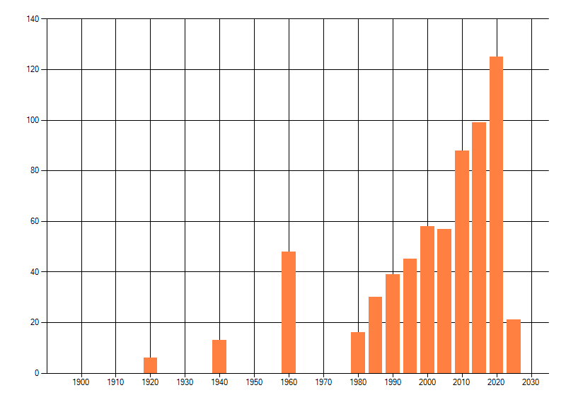 Het aantal atlasblokken (5x5 km) waarin de soort is gemeld binnen een periode van vijf jaar (vanaf 1980) of twintig jaar. Niet gecorrigeerd voor waarnemersinspanning en het aantal doorgegeven waarnemingen kan sterk variëren per periode, dus een trend in verspreiding kan hier niet direct uit worden afgelezen. Het opgegeven jaartal is het eerste jaar van de periode. Bron: gevalideerde waarnemingen uit de NDFF.