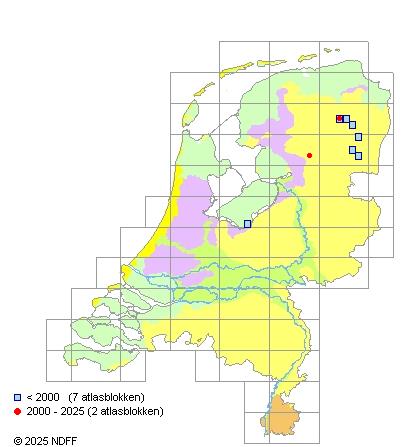 Het geschatte aantal atlasblokken (5x5 km) waarin de soort voorkomt per periode van vijf jaar. Bron: A. Aptroot et al. Basisrapport Rode Lijst Korstmossen 2011 © BLWG 2012.
