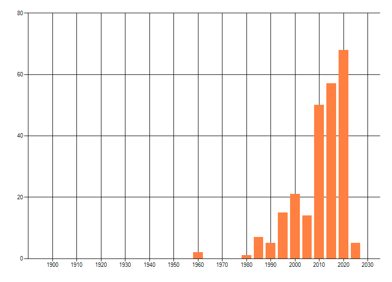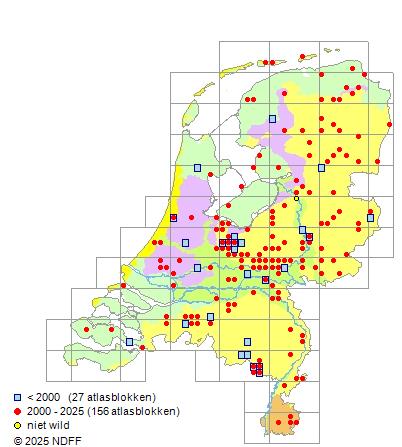 Het aantal atlasblokken (5x5 km) waarin de soort is gemeld binnen een periode van vijf jaar (vanaf 1980) of twintig jaar. Niet gecorrigeerd voor waarnemersinspanning en het aantal doorgegeven waarnemingen kan sterk variëren per periode, dus een trend in verspreiding kan hier niet direct uit worden afgelezen. Het opgegeven jaartal is het eerste jaar van de periode. Bron: gevalideerde waarnemingen uit de NDFF.
