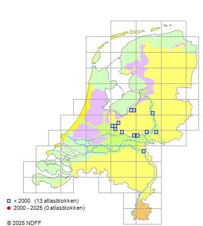 Het aantal atlasblokken (5x5 km) waarin de soort is gemeld binnen een periode van vijf jaar (vanaf 1980) of twintig jaar. Niet gecorrigeerd voor waarnemersinspanning en het aantal doorgegeven waarnemingen kan sterk variëren per periode, dus een trend in verspreiding kan hier niet direct uit worden afgelezen. Het opgegeven jaartal is het eerste jaar van de periode. Bron: gevalideerde waarnemingen uit de NDFF.
