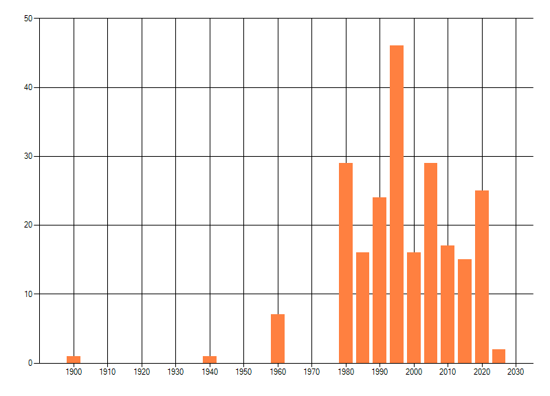 Het aantal atlasblokken (5x5 km) waarin de soort is gemeld binnen een periode van vijf jaar (vanaf 1980) of twintig jaar. Niet gecorrigeerd voor waarnemersinspanning en het aantal doorgegeven waarnemingen kan sterk variëren per periode, dus een trend in verspreiding kan hier niet direct uit worden afgelezen. Het opgegeven jaartal is het eerste jaar van de periode. Bron: gevalideerde waarnemingen uit de NDFF.