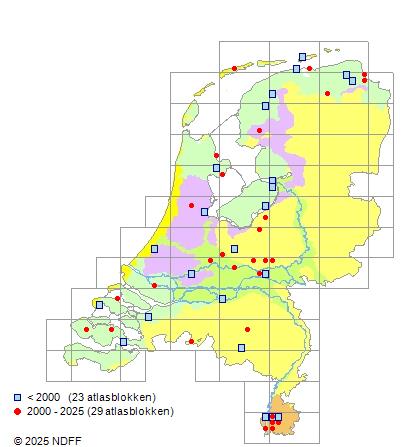 Het aantal atlasblokken (5x5 km) waarin de soort is gemeld binnen een periode van vijf jaar (vanaf 1980) of twintig jaar. Niet gecorrigeerd voor waarnemersinspanning en het aantal doorgegeven waarnemingen kan sterk variëren per periode, dus een trend in verspreiding kan hier niet direct uit worden afgelezen. Het opgegeven jaartal is het eerste jaar van de periode. Bron: gevalideerde waarnemingen uit de NDFF.