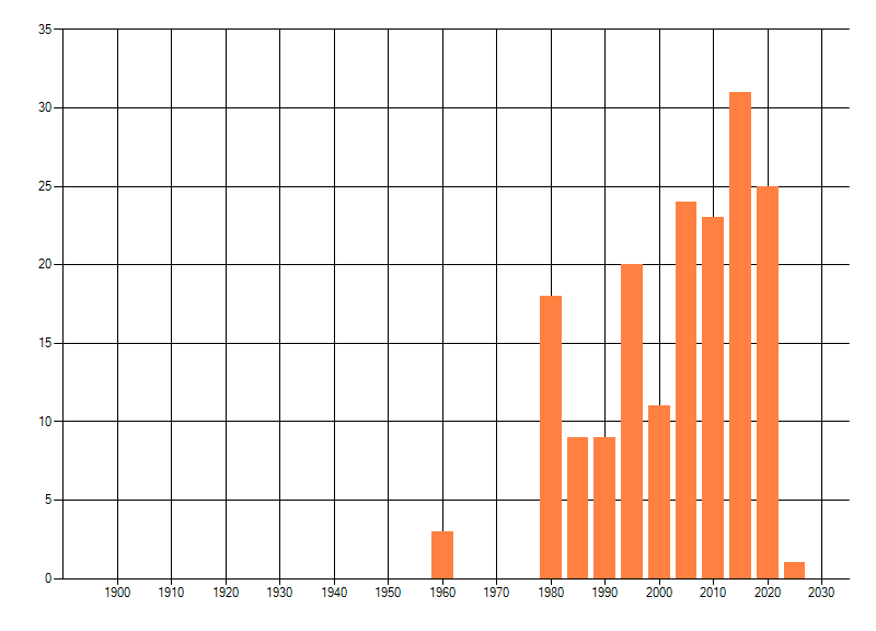 Het aantal atlasblokken (5x5 km) waarin de soort is gemeld binnen een periode van vijf jaar (vanaf 1980) of twintig jaar. Niet gecorrigeerd voor waarnemersinspanning en het aantal doorgegeven waarnemingen kan sterk variëren per periode, dus een trend in verspreiding kan hier niet direct uit worden afgelezen. Het opgegeven jaartal is het eerste jaar van de periode. Bron: gevalideerde waarnemingen uit de NDFF.
