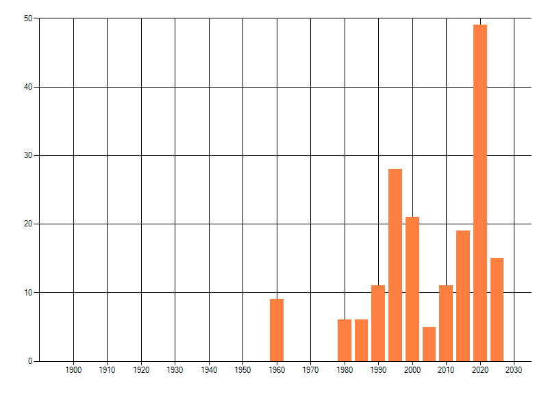 Het aantal atlasblokken (5x5 km) waarin de soort is gemeld binnen een periode van vijf jaar (vanaf 1980) of twintig jaar. Niet gecorrigeerd voor waarnemersinspanning en het aantal doorgegeven waarnemingen kan sterk variëren per periode, dus een trend in verspreiding kan hier niet direct uit worden afgelezen. Het opgegeven jaartal is het eerste jaar van de periode. Bron: gevalideerde waarnemingen uit de NDFF.