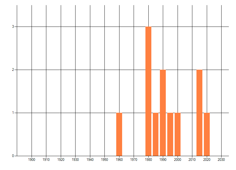 Het aantal atlasblokken (5x5 km) waarin de soort is gemeld binnen een periode van vijf jaar (vanaf 1980) of twintig jaar. Niet gecorrigeerd voor waarnemersinspanning en het aantal doorgegeven waarnemingen kan sterk variëren per periode, dus een trend in verspreiding kan hier niet direct uit worden afgelezen. Het opgegeven jaartal is het eerste jaar van de periode. Bron: gevalideerde waarnemingen uit de NDFF.