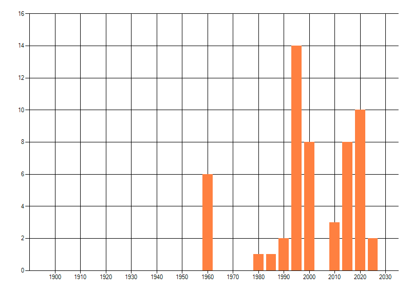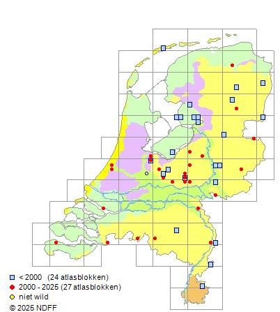Het aantal atlasblokken (5x5 km) waarin de soort is gemeld binnen een periode van vijf jaar (vanaf 1980) of twintig jaar. Niet gecorrigeerd voor waarnemersinspanning en het aantal doorgegeven waarnemingen kan sterk variƫren per periode, dus een trend in verspreiding kan hier niet direct uit worden afgelezen. Het opgegeven jaartal is het eerste jaar van de periode. Bron: gevalideerde waarnemingen uit de NDFF.