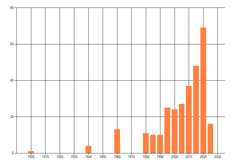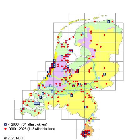 Het aantal atlasblokken (5x5 km) waarin de soort is gemeld binnen een periode van vijf jaar (vanaf 1980) of twintig jaar. Niet gecorrigeerd voor waarnemersinspanning en het aantal doorgegeven waarnemingen kan sterk variƫren per periode, dus een trend in verspreiding kan hier niet direct uit worden afgelezen. Het opgegeven jaartal is het eerste jaar van de periode. Bron: gevalideerde waarnemingen uit de NDFF.