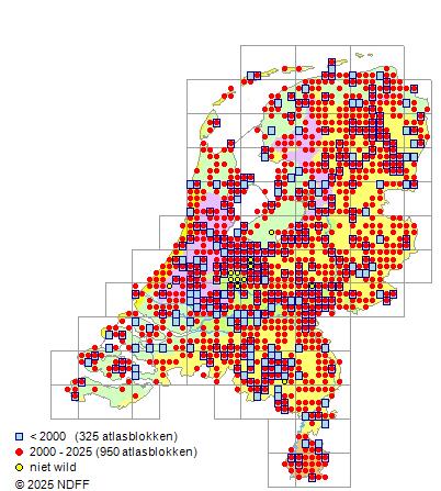 Het aantal atlasblokken (5x5 km) waarin de soort is gemeld binnen een periode van vijf jaar (vanaf 1980) of twintig jaar. Niet gecorrigeerd voor waarnemersinspanning en het aantal doorgegeven waarnemingen kan sterk variëren per periode, dus een trend in verspreiding kan hier niet direct uit worden afgelezen. Het opgegeven jaartal is het eerste jaar van de periode. Bron: gevalideerde waarnemingen uit de NDFF.
