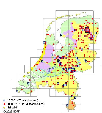 Het aantal atlasblokken (5x5 km) waarin de soort is gemeld binnen een periode van vijf jaar (vanaf 1980) of twintig jaar. Niet gecorrigeerd voor waarnemersinspanning en het aantal doorgegeven waarnemingen kan sterk variëren per periode, dus een trend in verspreiding kan hier niet direct uit worden afgelezen. Het opgegeven jaartal is het eerste jaar van de periode. Bron: gevalideerde waarnemingen uit de NDFF.