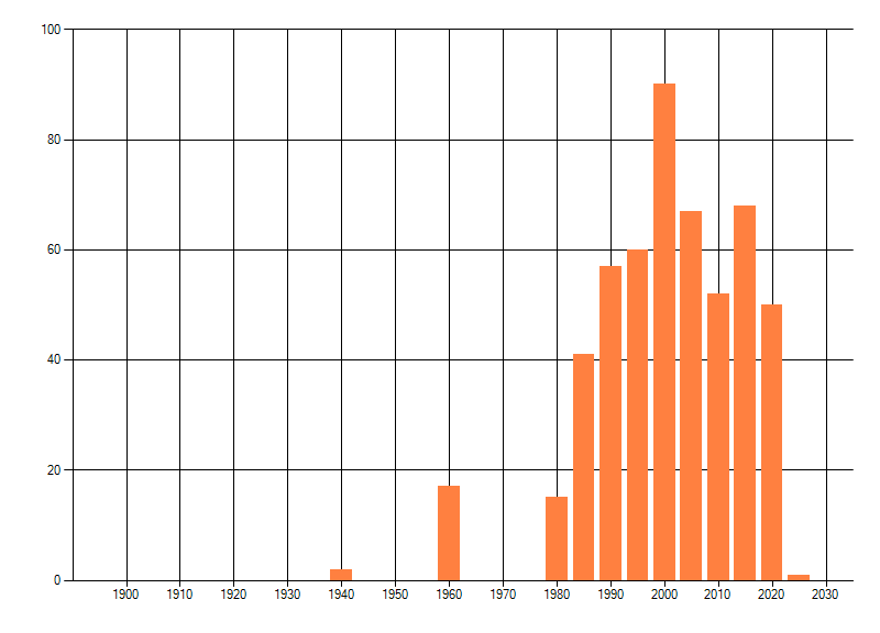 Het aantal atlasblokken (5x5 km) waarin de soort is gemeld binnen een periode van vijf jaar (vanaf 1980) of twintig jaar. Niet gecorrigeerd voor waarnemersinspanning en het aantal doorgegeven waarnemingen kan sterk variëren per periode, dus een trend in verspreiding kan hier niet direct uit worden afgelezen. Het opgegeven jaartal is het eerste jaar van de periode. Bron: gevalideerde waarnemingen uit de NDFF.
