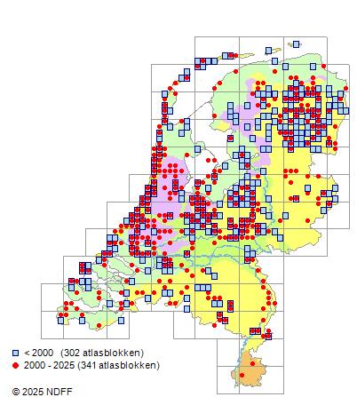 Het aantal atlasblokken (5x5 km) waarin de soort is gemeld binnen een periode van vijf jaar (vanaf 1980) of twintig jaar. Niet gecorrigeerd voor waarnemersinspanning en het aantal doorgegeven waarnemingen kan sterk variëren per periode, dus een trend in verspreiding kan hier niet direct uit worden afgelezen. Het opgegeven jaartal is het eerste jaar van de periode. Bron: gevalideerde waarnemingen uit de NDFF.