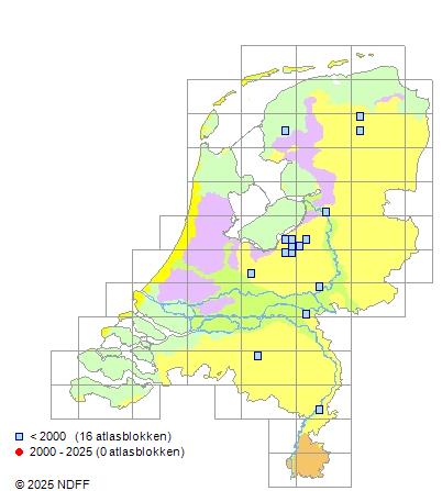 Het aantal atlasblokken (5x5 km) waarin de soort is gemeld binnen een periode van vijf jaar (vanaf 1980) of twintig jaar.