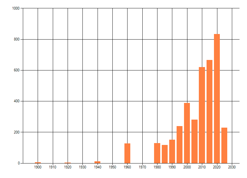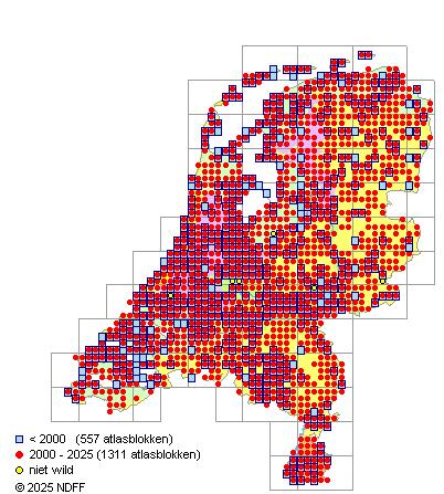Het aantal atlasblokken (5x5 km) waarin de soort is gemeld binnen een periode van vijf jaar (vanaf 1980) of twintig jaar. Niet gecorrigeerd voor waarnemersinspanning en het aantal doorgegeven waarnemingen kan sterk variëren per periode, dus een trend in verspreiding kan hier niet direct uit worden afgelezen. Het opgegeven jaartal is het eerste jaar van de periode. Bron: gevalideerde waarnemingen uit de NDFF.