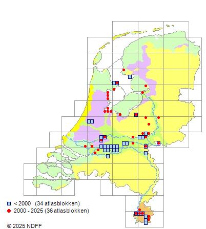 Het aantal atlasblokken (5x5 km) waarin de soort is gemeld binnen een periode van vijf jaar (vanaf 1980) of twintig jaar. Niet gecorrigeerd voor waarnemersinspanning en het aantal doorgegeven waarnemingen kan sterk variëren per periode, dus een trend in verspreiding kan hier niet direct uit worden afgelezen. Het opgegeven jaartal is het eerste jaar van de periode. Bron: gevalideerde waarnemingen uit de NDFF.