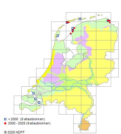 Het aantal atlasblokken (5x5 km) waarin de soort is gemeld binnen een periode van vijf jaar (vanaf 1980) of twintig jaar. Niet gecorrigeerd voor waarnemersinspanning en het aantal doorgegeven waarnemingen kan sterk variëren per periode, dus een trend in verspreiding kan hier niet direct uit worden afgelezen. Het opgegeven jaartal is het eerste jaar van de periode. Bron: gevalideerde waarnemingen uit de NDFF.