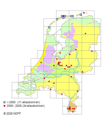 download in hoge resolutieHet geschatte aantal atlasblokken (5x5 km) waarin de soort voorkomt per periode van vijf jaar. Bron: A. Aptroot et al. Basisrapport Rode Lijst Korstmossen 2011 © BLWG 2012.