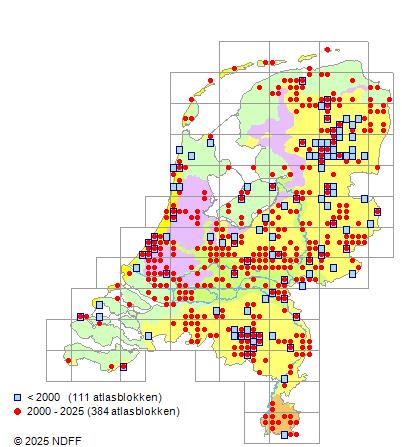 Het aantal atlasblokken (5x5 km) waarin de soort is gemeld binnen een periode van vijf jaar (vanaf 1980) of twintig jaar. Niet gecorrigeerd voor waarnemersinspanning en het aantal doorgegeven waarnemingen kan sterk variëren per periode, dus een trend in verspreiding kan hier niet direct uit worden afgelezen. Het opgegeven jaartal is het eerste jaar van de periode. Bron: gevalideerde waarnemingen uit de NDFF.