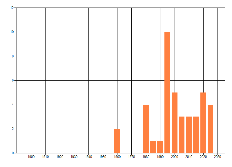Het aantal atlasblokken (5x5 km) waarin de soort is gemeld binnen een periode van vijf jaar (vanaf 1980) of twintig jaar. Niet gecorrigeerd voor waarnemersinspanning en het aantal doorgegeven waarnemingen kan sterk variëren per periode, dus een trend in verspreiding kan hier niet direct uit worden afgelezen. Het opgegeven jaartal is het eerste jaar van de periode. Bron: gevalideerde waarnemingen uit de NDFF.