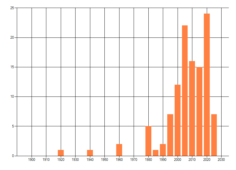Het aantal atlasblokken (5x5 km) waarin de soort is gemeld binnen een periode van vijf jaar (vanaf 1980) of twintig jaar. Niet gecorrigeerd voor waarnemersinspanning en het aantal doorgegeven waarnemingen kan sterk variëren per periode, dus een trend in verspreiding kan hier niet direct uit worden afgelezen. Het opgegeven jaartal is het eerste jaar van de periode. Bron: gevalideerde waarnemingen uit de NDFF.