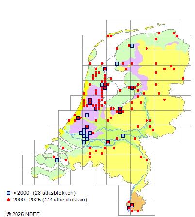 Het aantal atlasblokken (5x5 km) waarin de soort is gemeld binnen een periode van vijf jaar (vanaf 1980) of twintig jaar. Niet gecorrigeerd voor waarnemersinspanning en het aantal doorgegeven waarnemingen kan sterk variëren per periode, dus een trend in verspreiding kan hier niet direct uit worden afgelezen. Het opgegeven jaartal is het eerste jaar van de periode. Bron: gevalideerde waarnemingen uit de NDFF.