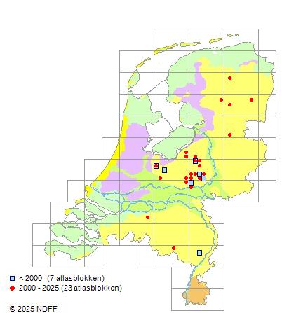 Het aantal atlasblokken (5x5 km) waarin de soort is gemeld binnen een periode van vijf jaar (vanaf 1980) of twintig jaar. Niet gecorrigeerd voor waarnemersinspanning en het aantal doorgegeven waarnemingen kan sterk variëren per periode, dus een trend in verspreiding kan hier niet direct uit worden afgelezen. Het opgegeven jaartal is het eerste jaar van de periode. Bron: gevalideerde waarnemingen uit de NDFF.
