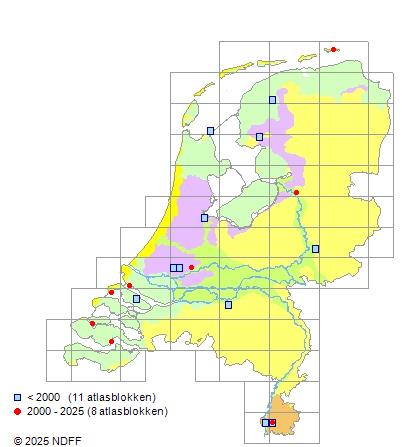 Het aantal atlasblokken (5x5 km) waarin de soort is gemeld binnen een periode van vijf jaar (vanaf 1980) of twintig jaar. Niet gecorrigeerd voor waarnemersinspanning en het aantal doorgegeven waarnemingen kan sterk variëren per periode, dus een trend in verspreiding kan hier niet direct uit worden afgelezen. Het opgegeven jaartal is het eerste jaar van de periode. Bron: gevalideerde waarnemingen uit de NDFF.