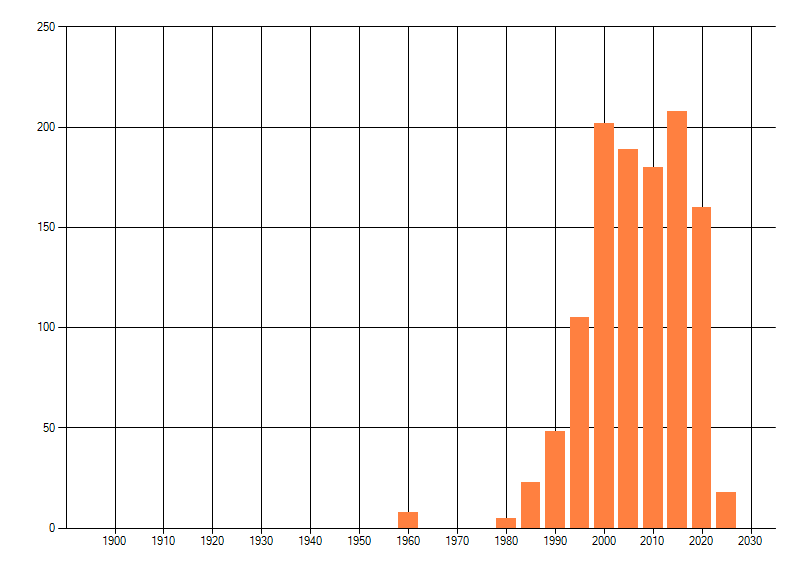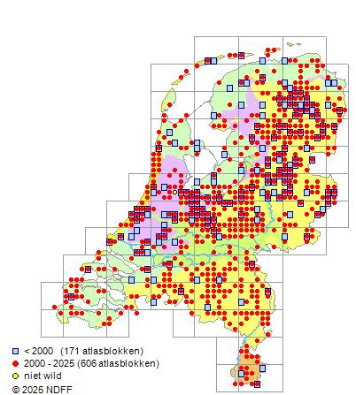 Het aantal atlasblokken (5x5 km) waarin de soort is gemeld binnen een periode van vijf jaar (vanaf 1980) of twintig jaar. Niet gecorrigeerd voor waarnemersinspanning en het aantal doorgegeven waarnemingen kan sterk variëren per periode, dus een trend in verspreiding kan hier niet direct uit worden afgelezen. Het opgegeven jaartal is het eerste jaar van de periode. Bron: gevalideerde waarnemingen uit de NDFF.
