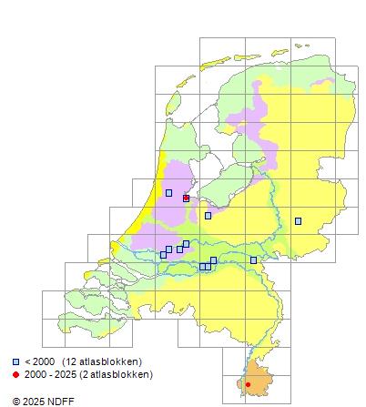Het aantal atlasblokken (5x5 km) waarin de soort is gemeld binnen een periode van vijf jaar (vanaf 1980) of twintig jaar. Niet gecorrigeerd voor waarnemersinspanning en het aantal doorgegeven waarnemingen kan sterk variëren per periode, dus een trend in verspreiding kan hier niet direct uit worden afgelezen. Het opgegeven jaartal is het eerste jaar van de periode. Bron: gevalideerde waarnemingen uit de NDFF.