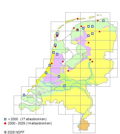 Het aantal atlasblokken (5x5 km) waarin de soort is gemeld binnen een periode van vijf jaar (vanaf 1980) of twintig jaar. Niet gecorrigeerd voor waarnemersinspanning en het aantal doorgegeven waarnemingen kan sterk variëren per periode, dus een trend in verspreiding kan hier niet direct uit worden afgelezen. Het opgegeven jaartal is het eerste jaar van de periode. Bron: gevalideerde waarnemingen uit de NDFF.