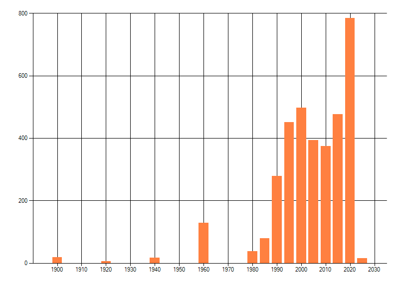 Het aantal atlasblokken (5x5 km) waarin de soort is gemeld binnen een periode van vijf jaar (vanaf 1980) of twintig jaar. Niet gecorrigeerd voor waarnemersinspanning en het aantal doorgegeven waarnemingen kan sterk variëren per periode, dus een trend in verspreiding kan hier niet direct uit worden afgelezen. Het opgegeven jaartal is het eerste jaar van de periode. Bron: gevalideerde waarnemingen uit de NDFF.