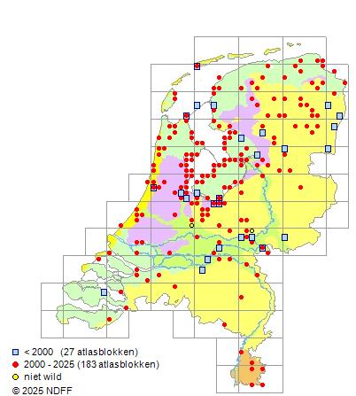 Het aantal atlasblokken (5x5 km) waarin de soort is gemeld binnen een periode van vijf jaar (vanaf 1980) of twintig jaar. Niet gecorrigeerd voor waarnemersinspanning en het aantal doorgegeven waarnemingen kan sterk variëren per periode, dus een trend in verspreiding kan hier niet direct uit worden afgelezen. Het opgegeven jaartal is het eerste jaar van de periode. Bron: gevalideerde waarnemingen uit de NDFF.