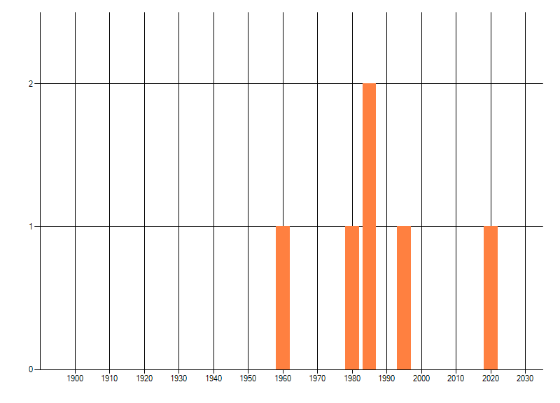 Het aantal atlasblokken (5x5 km) waarin de soort is gemeld binnen een periode van vijf jaar (vanaf 1980) of twintig jaar. Niet gecorrigeerd voor waarnemersinspanning en het aantal doorgegeven waarnemingen kan sterk variëren per periode, dus een trend in verspreiding kan hier niet direct uit worden afgelezen. Het opgegeven jaartal is het eerste jaar van de periode. Bron: gevalideerde waarnemingen uit de NDFF.