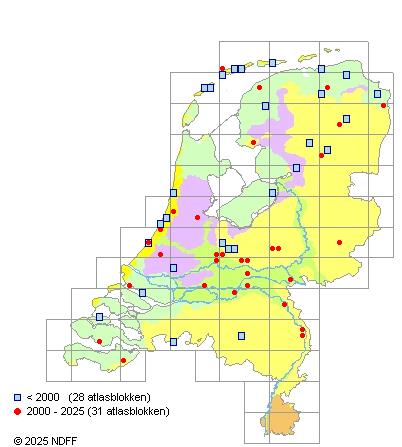 Het aantal atlasblokken (5x5 km) waarin de soort is gemeld binnen een periode van vijf jaar (vanaf 1980) of twintig jaar. Niet gecorrigeerd voor waarnemersinspanning en het aantal doorgegeven waarnemingen kan sterk variëren per periode, dus een trend in verspreiding kan hier niet direct uit worden afgelezen. Het opgegeven jaartal is het eerste jaar van de periode. Bron: gevalideerde waarnemingen uit de NDFF.