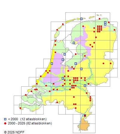 Het aantal atlasblokken (5x5 km) waarin de soort is gemeld binnen een periode van vijf jaar (vanaf 1980) of twintig jaar. Niet gecorrigeerd voor waarnemersinspanning en het aantal doorgegeven waarnemingen kan sterk variëren per periode, dus een trend in verspreiding kan hier niet direct uit worden afgelezen. Het opgegeven jaartal is het eerste jaar van de periode. Bron: gevalideerde waarnemingen uit de NDFF.