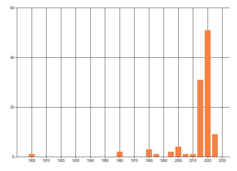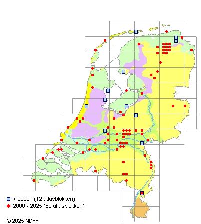 Het aantal atlasblokken (5x5 km) waarin de soort is gemeld binnen een periode van vijf jaar (vanaf 1980) of twintig jaar. Niet gecorrigeerd voor waarnemersinspanning en het aantal doorgegeven waarnemingen kan sterk variëren per periode, dus een trend in verspreiding kan hier niet direct uit worden afgelezen. Het opgegeven jaartal is het eerste jaar van de periode. Bron: gevalideerde waarnemingen uit de NDFF.