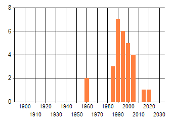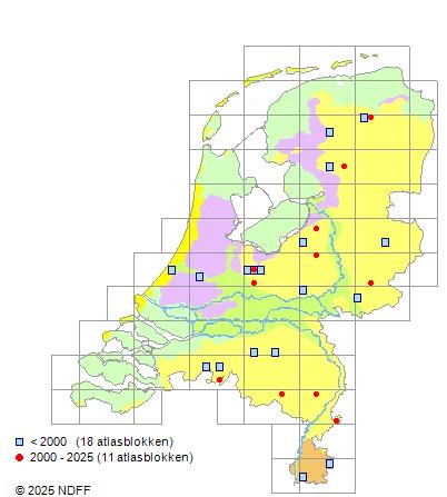Het aantal atlasblokken (5x5 km) waarin de soort is gemeld binnen een periode van vijf jaar (vanaf 1980) of twintig jaar. Niet gecorrigeerd voor waarnemersinspanning en het aantal doorgegeven waarnemingen kan sterk variëren per periode, dus een trend in verspreiding kan hier niet direct uit worden afgelezen. Het opgegeven jaartal is het eerste jaar van de periode. Bron: gevalideerde waarnemingen uit de NDFF.