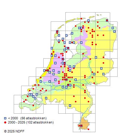 Het aantal atlasblokken (5x5 km) waarin de soort is gemeld binnen een periode van vijf jaar (vanaf 1980) of twintig jaar. Niet gecorrigeerd voor waarnemersinspanning en het aantal doorgegeven waarnemingen kan sterk variëren per periode, dus een trend in verspreiding kan hier niet direct uit worden afgelezen. Het opgegeven jaartal is het eerste jaar van de periode. Bron: gevalideerde waarnemingen uit de NDFF.